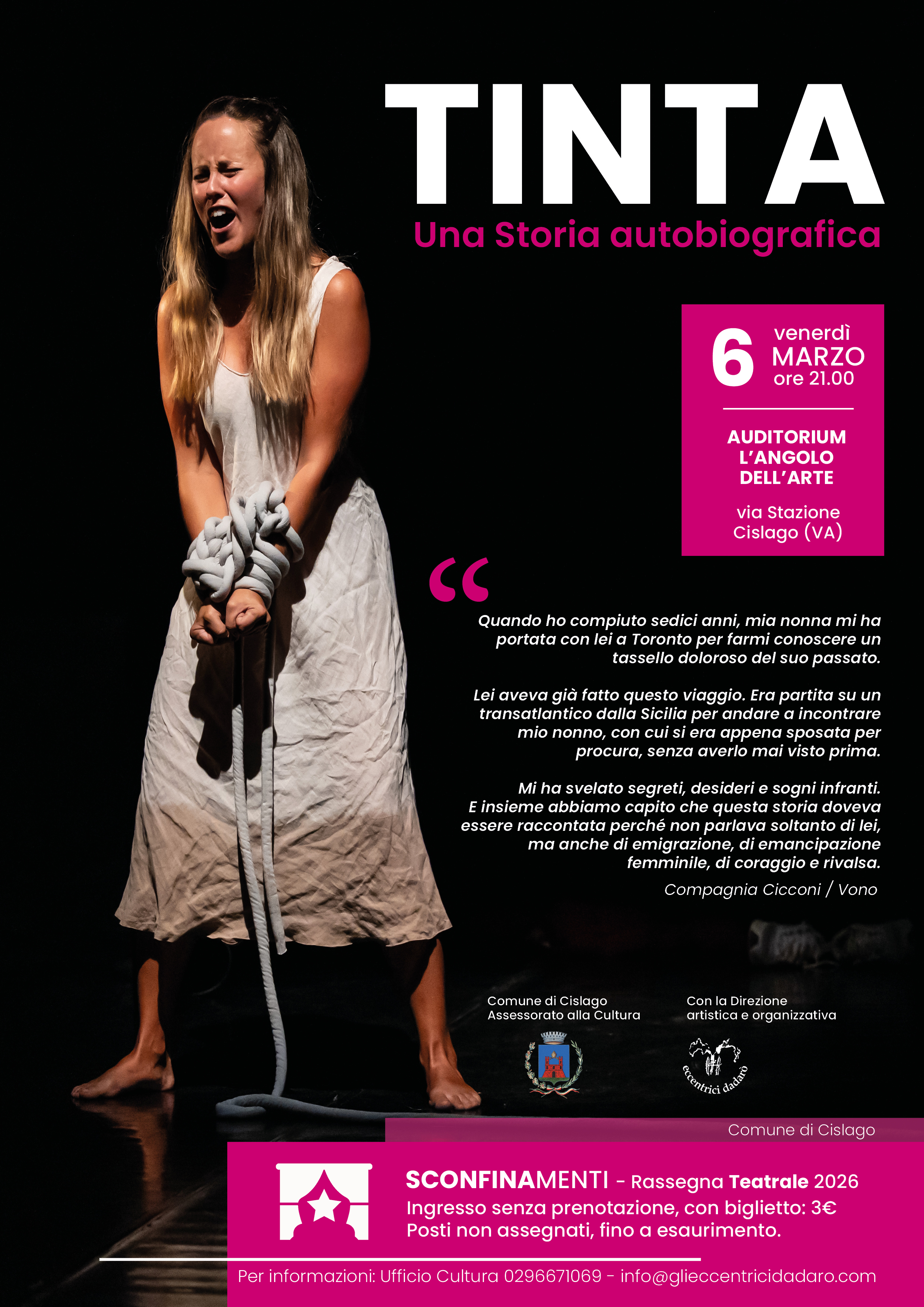 L’appuntamento è inserito nella programmazione di SCONFINAMENTI Rassegna Teatrale 2026, organizzata dal Comune di Cislago, con la direzione artistica de Gli Eccentrici Dadarò.